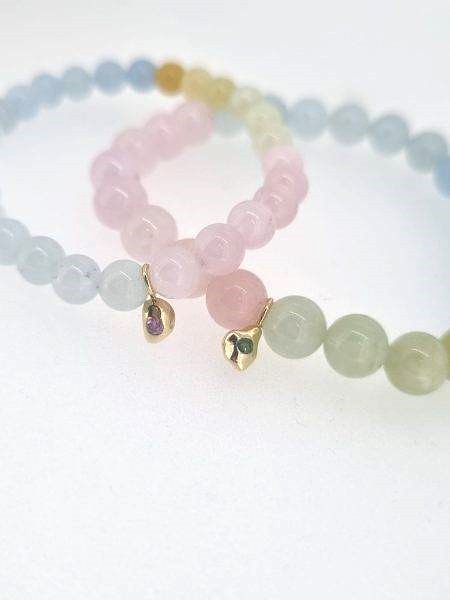 De Armband Pura – Rozenkwarts en gecombineerd gekleurde Beryl met Gouden Druppel Bedel en Roze Diamant is een handgemaakt sieraad dat elegantie en verfijning samenbrengt. De 6 mm kralen van rozenkwarts en beryl geven een zachte en levendige glans, terwijl de gouden druppel bedel met 0,05 ct roze diamant een subtiel luxe accent toevoegt.
