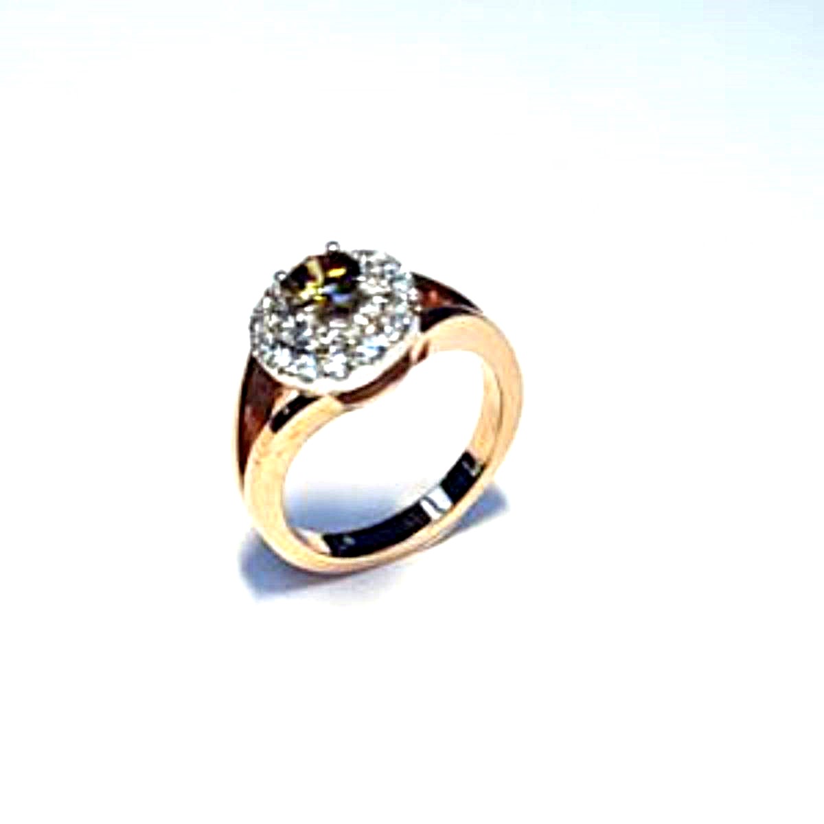 18kt roségouden ring. Bezet met 1 0,35ct. fancy gekleurde diamant welke is omzet met 0,42ct. aan witte diamanten.