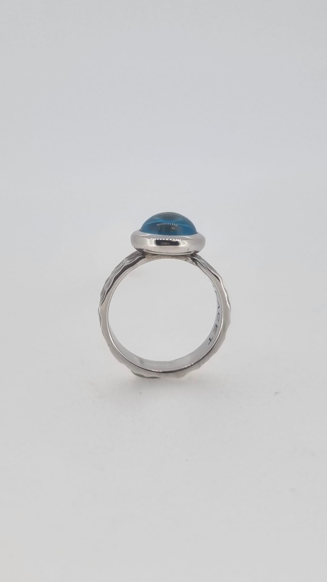 De Ring Balance of Nature in 18kt witgoud is gezet met een blauwe topaas. Het ontwerp combineert strakke lijnen met een natuurlijke reliëf, wat zorgt voor een elegante balans tussen modern en organisch.