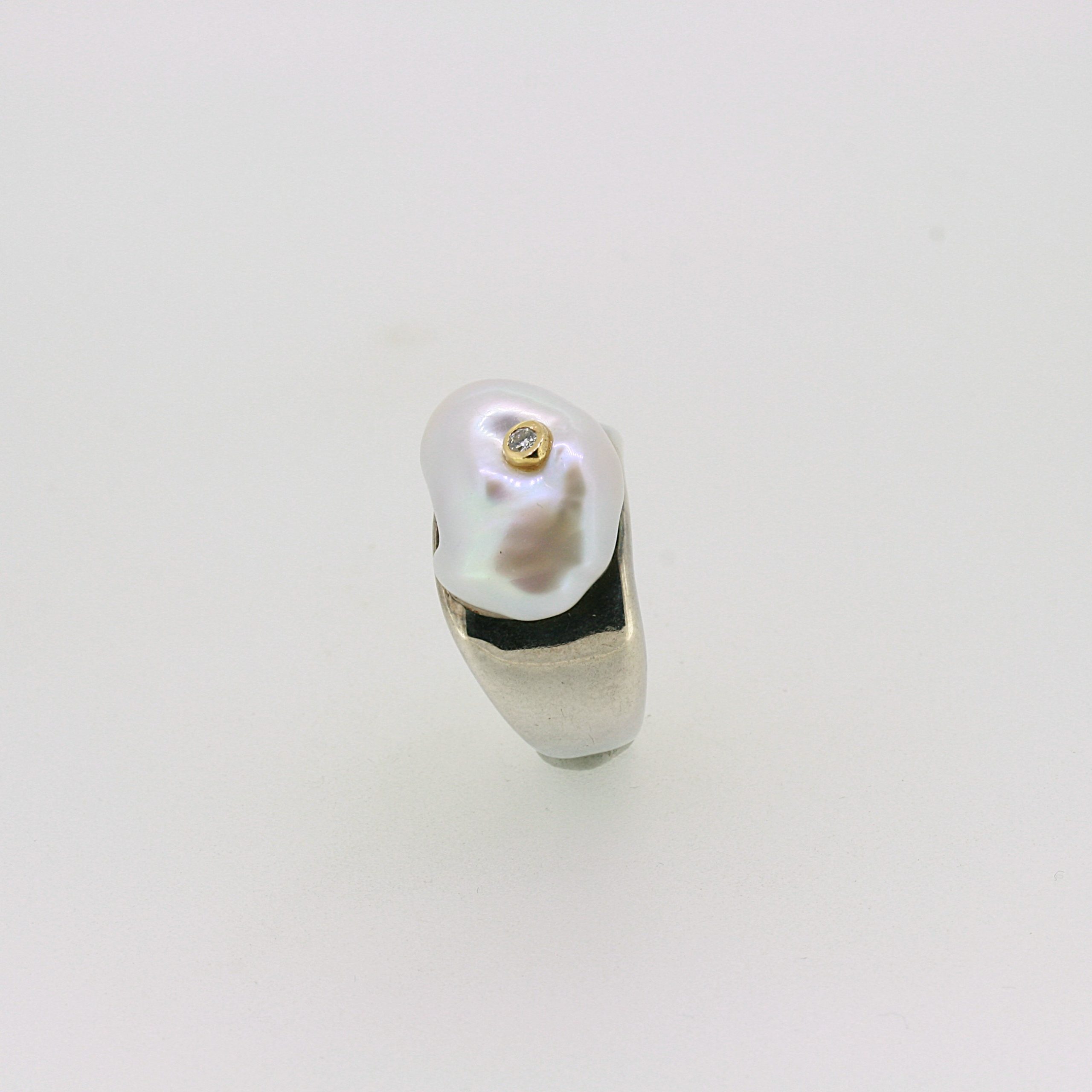 In het hart van de parel schittert een 0,05 ct diamant, elegant gezet in een 18kt gouden zetting. Deze combinatie van zilver, goud, parel en diamant creëert een harmonieus contrast tussen stoer, warm en verfijnd.
